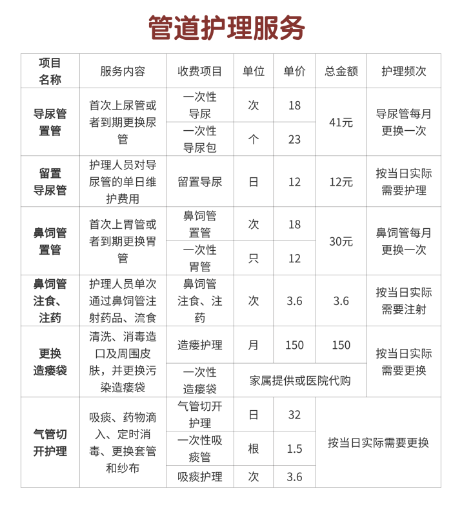 鼻饲管护理:置管或更换费用为 30元/次(含材料),每次通过鼻饲管注食、注药及护理收费 3.6元。